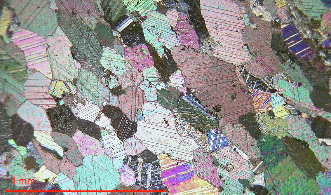 Brevikkalk er en kontaktmetamorf kalkstein – en marmor med kalkspatkrystaller. Den tette, krystalline strukturen gjør den til en “seigbrent” kalk. Mikrobilde, polarisasjonsmikroskop, krysspolarisert lys. Her fra et svært rent parti.