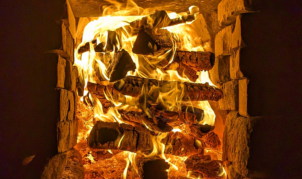 Fyring med kubber på kryss og tvers i hele ovnsåpningen for å trekke varmen lengre foran i oven