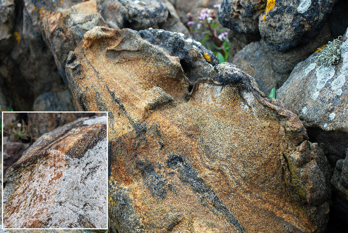 Forvitret amfibolitt med kismineraler, i fjæresonen på Spornes. Det er likevel havsalt (halitt) som fra tid til annen dekker det forvitrede området (innfelt). Halitt bestemt med mikroskopi. Foto: PS