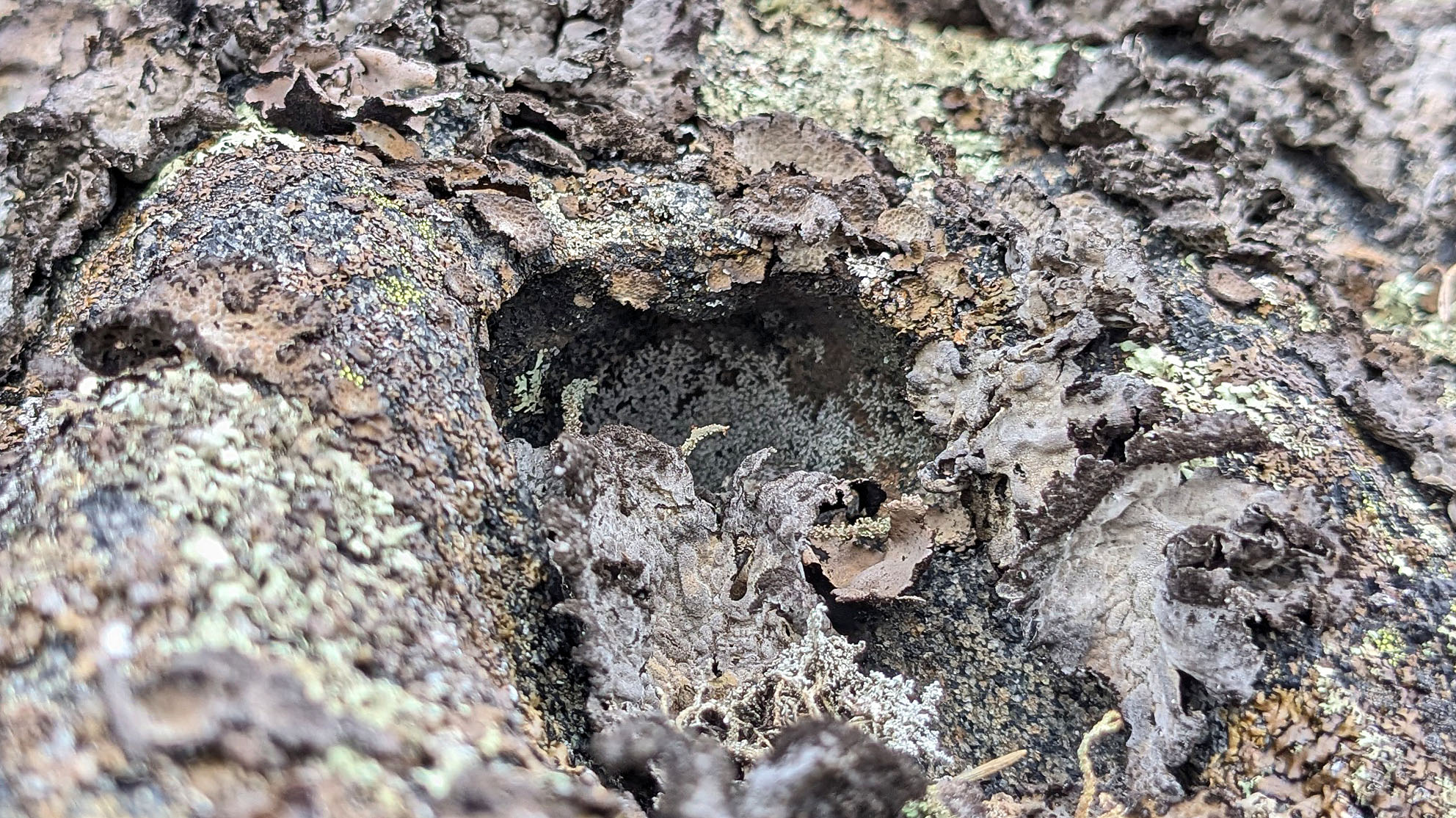 Skogsterreng, Tromøy. Tafoni under lav. Foto: PS
