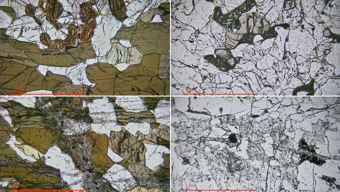 Mikrofotos, PPL, bergarter Spornes, Tromøy. Venstre: Amfibolitt med omvandlingsfenomener i pyroksen (over, oppe) og amfibol/plagioklas (under). Høyre: Tonalittisk gneis med granat (lysebrun) og omvandlet pyroksen (over), omvandlingsfenomener i plagioklas og riss med sekundære mineraler (under). Foto: PS