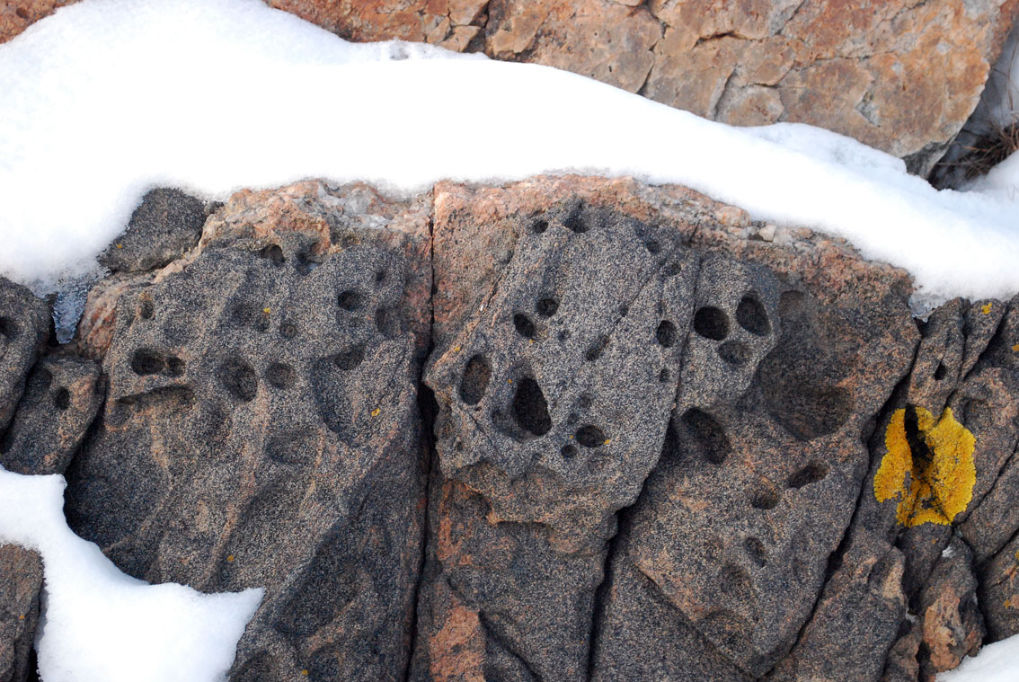 Tafoni i tynn amfibolittåre, Spornes. Etter hvert vil åren forsvinne av forvitringen og det er nå ingen tegn til at tafoni vil dannes i den hardere gneisen bak. Foto: PS
