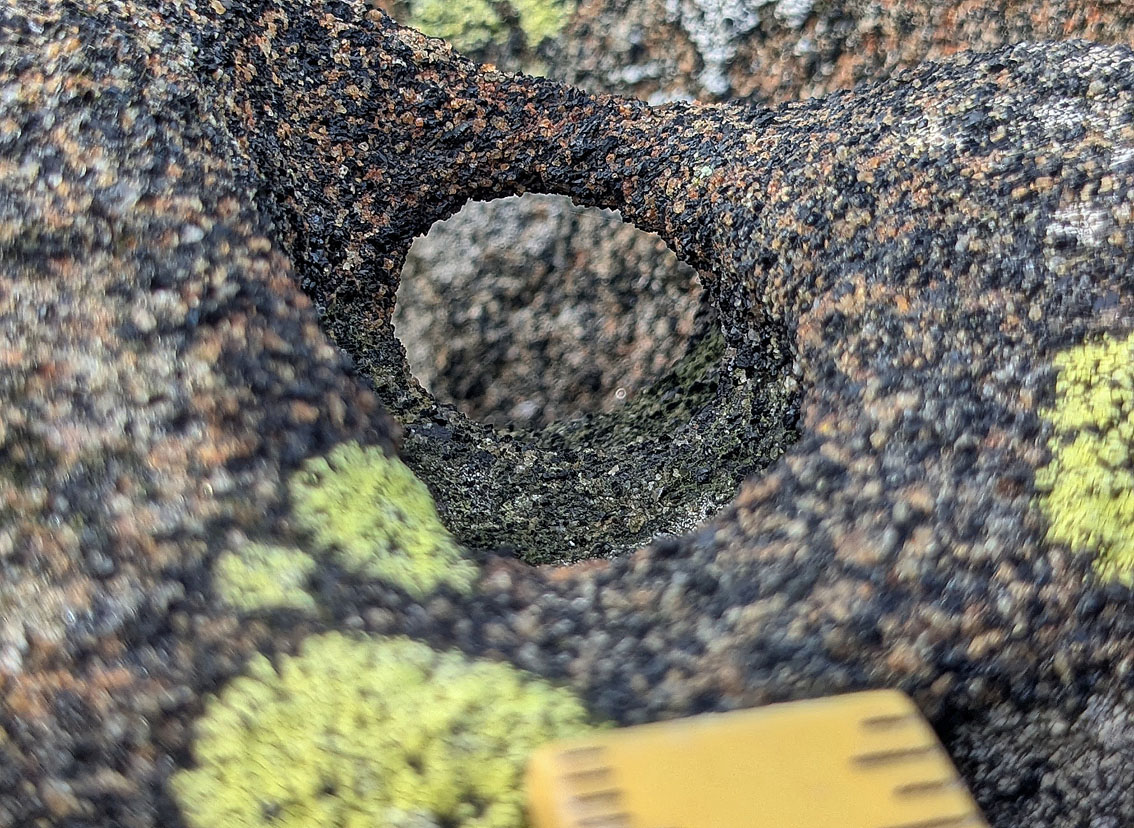 Pulverisering av “bro” laget av to tafonihull, Spornes. Bildebredde ca. 4 cm (bakkant)