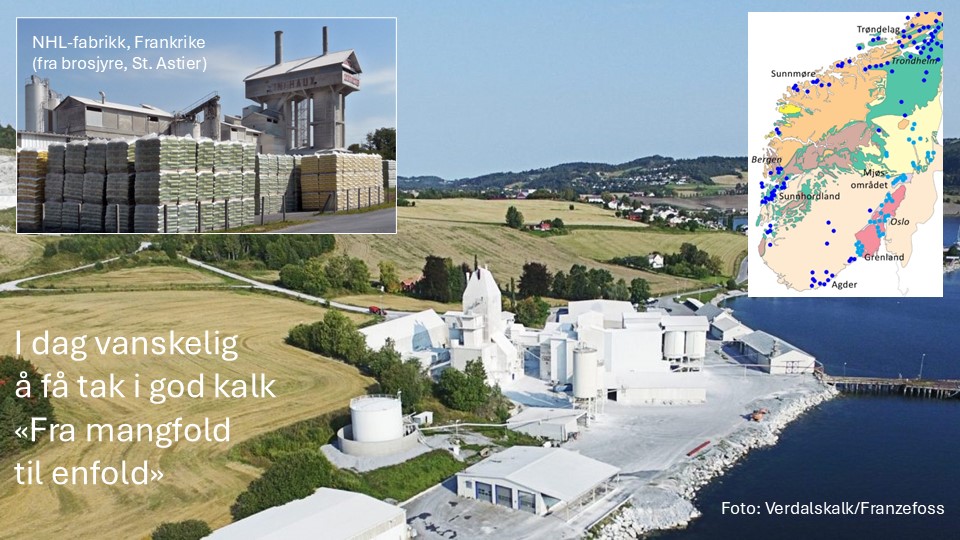 Så er det et problem at det produseres lite kalk i Norge nå. Det er en kalkfabrikk, på Hylla i Trøndelag. Ellers importerer vi mye fra f.eks. Frankrike.