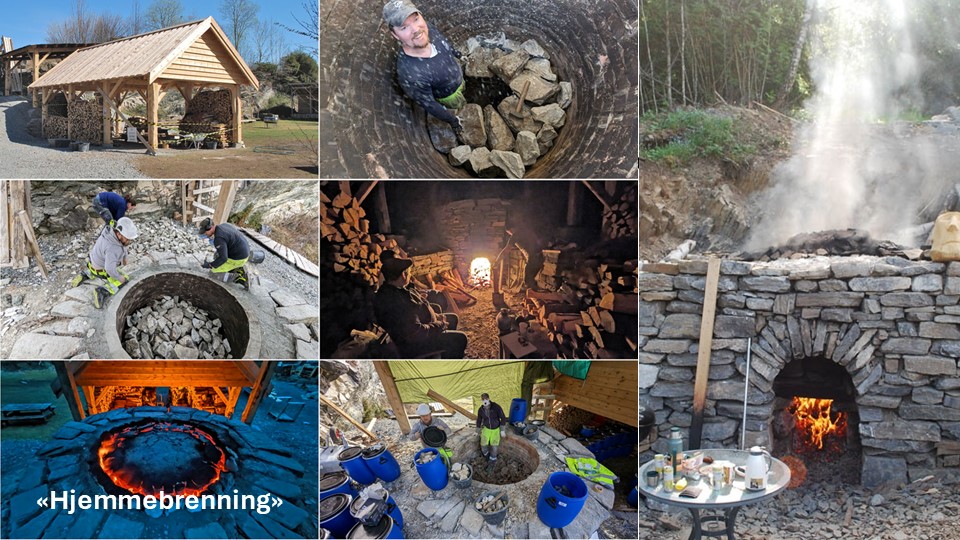 Tradisjonskalk for restaurering må vi ofte brenne selv. Her fra “nygamle” 10-tonns-ovner i Mosterhamn og på Helgøya ved Hamar.