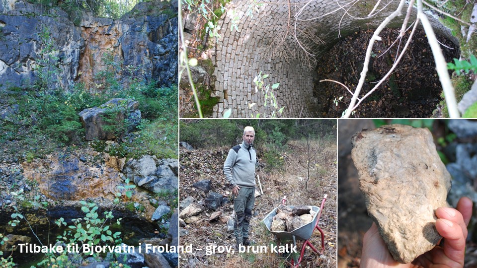 Tilbake til Bjorvatn på Øynaheia: Plukking av marmorbiter for brenning i Tvedestrand. Men marmoren er grov og brunlig…