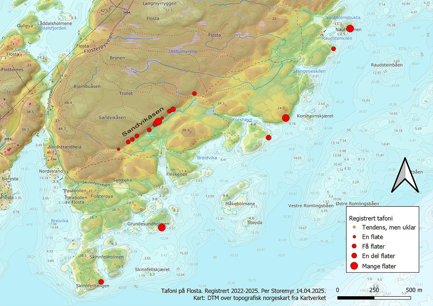 Kart over registrert tafoni på Flosta. Det er brattkanten kalt Sandvikåsen som i hovedsak er omtalt i artikkelen. Kart: PS