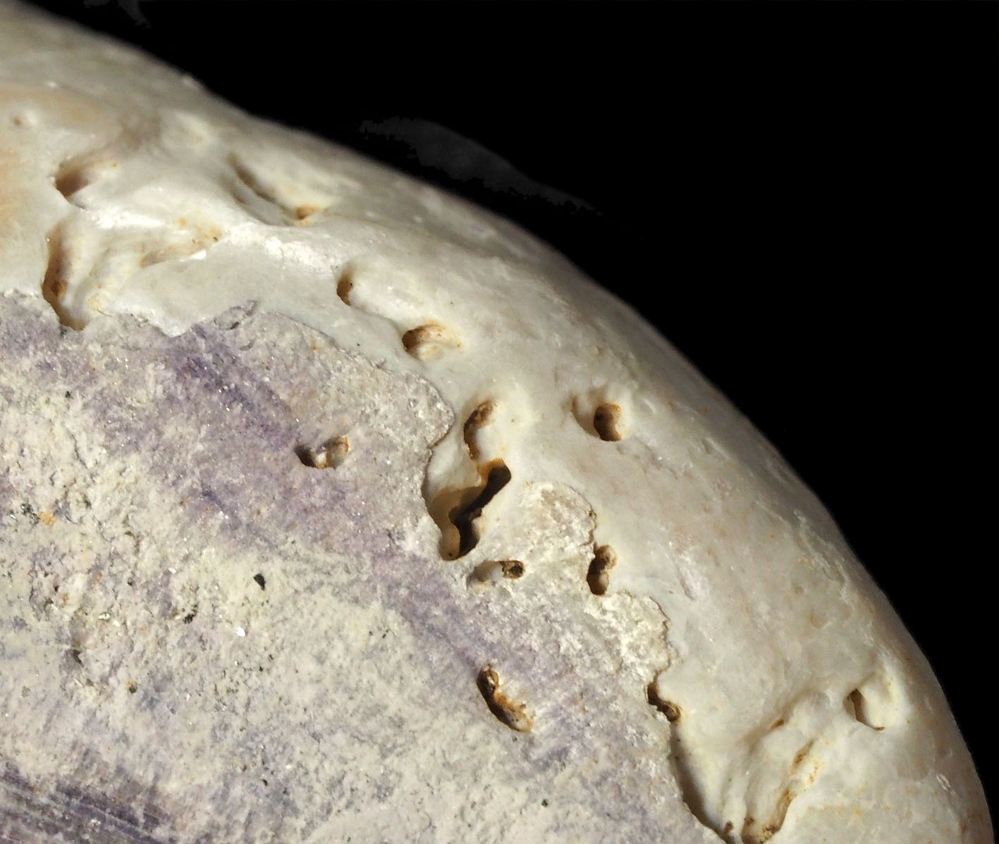 Borings in a blue mussel shell. Width of field 15 mm. Photo by PS