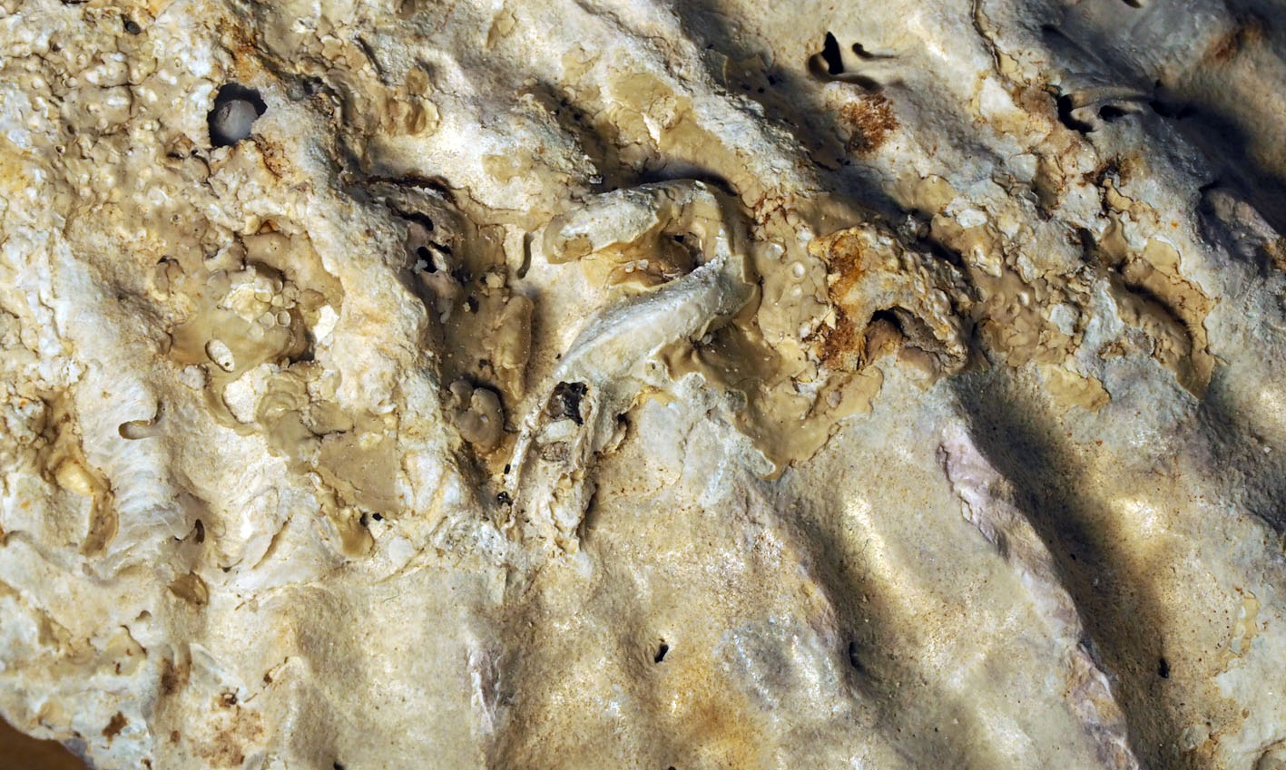 Worm tube and other secondary, micritic lime deposits on an oyster shell. Width of field 12 mm. Photo by PS