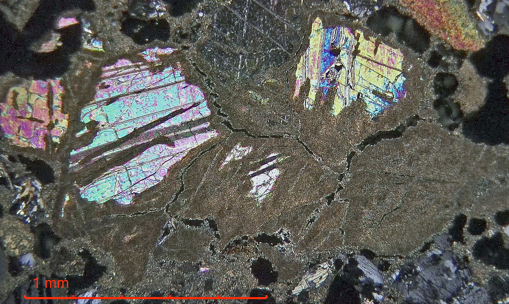 Underburnt marble fragment in mortar at Sakshaug old church, Central Norway. The colorful areas are remains of “fresh” marble. Microphoto (XPL) by PS