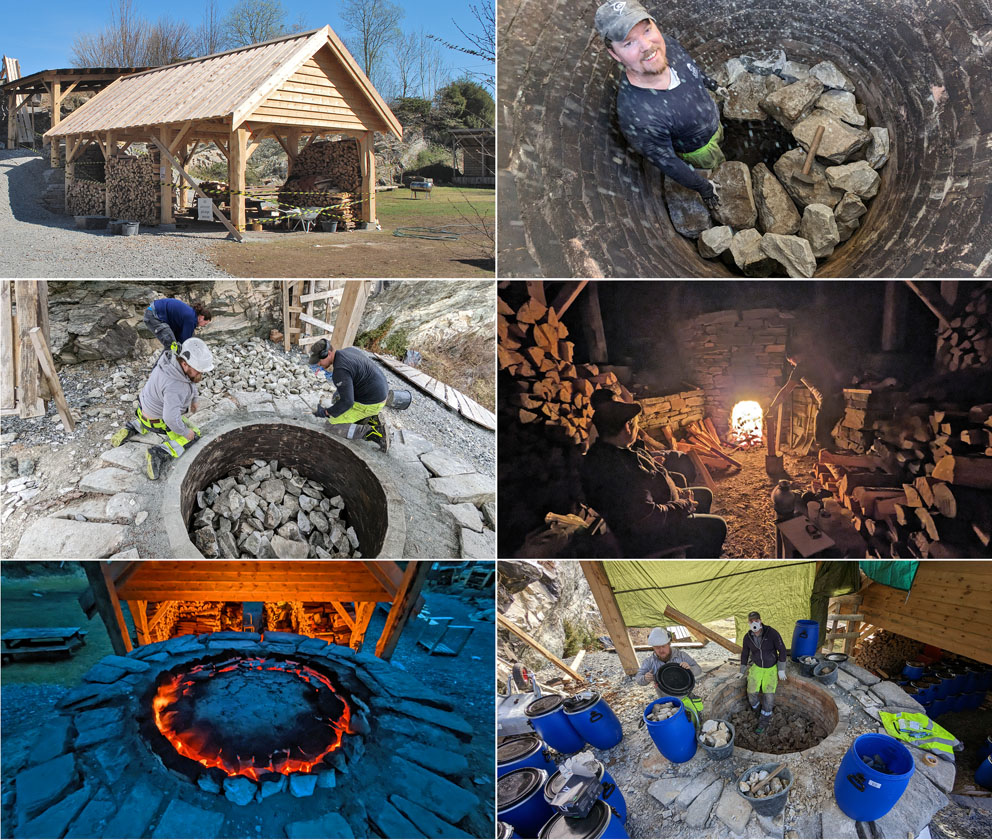 Figur 6: Det nye, tradisjonelle kalkovnsanlegget bygd i 2022 i Mosterhamn på Bømlo, som kurs støttet av Fortidsminneforeningen. Oppe fra venstre: 1) Steinbygd, ca. 8 tonns ovn i bakkant og vedhus/arbeidshus i forkant. 2) Bent Morten Steinsland bygger enkelt hvelv av marmorblokker før brenning. Hvelvet definerer fyrkammeret og er den mest sårbare delen av ovnen, da det utsettes for intens varme og kan kollapse ved feil i byggingen. 3) Fylling med marmorstykket over hvelvet. 4) Brenntiden er drøyt 3 døgn. 5) Glød i ovnen under lokk av leiremørtel for å holde på varmen. Åpning rundt periferien sikrer trekk. 6) Uttak, kvalitetssikring, sortering og pakking av den brente kalken. Foto: Per Storemyr