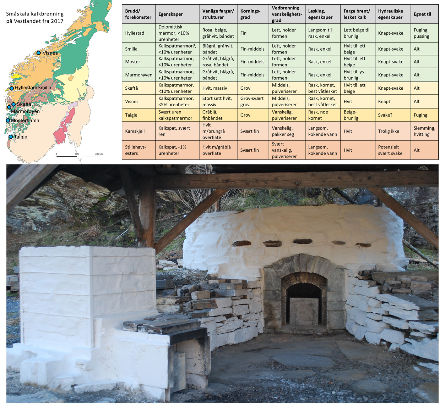 Figur 7: Det småskala kalkovnsanlegget i Hyllestad, med 2 tonns produksjonsovn bak og testovn i forkant, bygd 2017–2018. Her er det brent ca. 12 varianter av vestlandsmarmor gjennom 25 brenninger, hvorav egenskapene til de viktigste er listet i tabellen. Den er sortert etter hvor «lett» det er å brenne de ulike kalkene. Østersskjell og kamskjell er også brent. Sammenstilling og foto: Per Storemyr