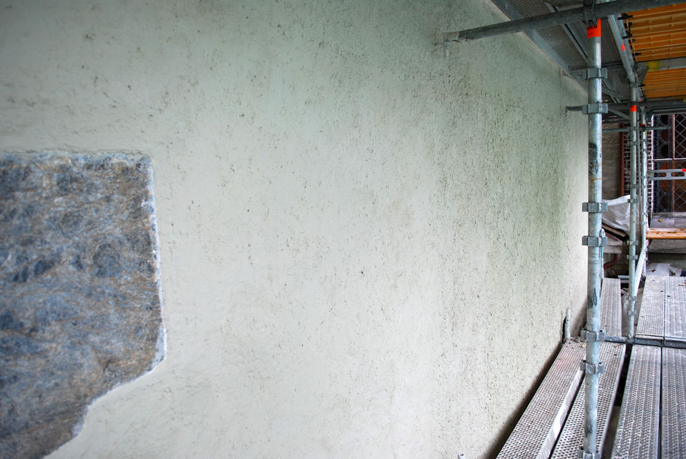 Bergen domkirke: Prøvefelt for spekking og pussing. Mosterkalk til høyre. Utført av Akasia AS
