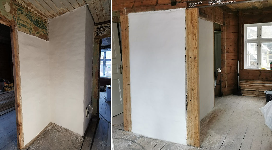 Eldre hus, Bergen: Brannmur reparert med Hyllestadkalk, Visneskalk og Skaftåkalk. Utført av Berit Bruvik (foto)