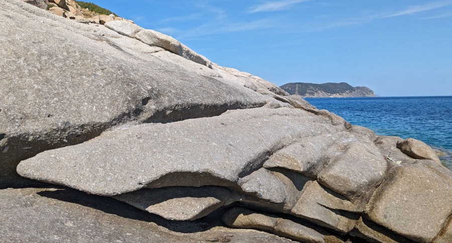 Spiaggia della Calle: Abraded granite and no tafoni in the zone of wave action. Note sheeiting and crack pattern. Photo by Per Storemyr