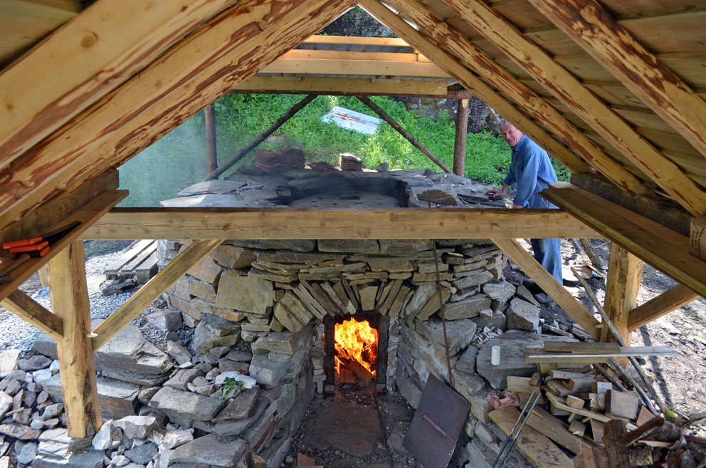 Storovnen i Hyllestad ved første brenning i 2017. En ovn bygd med stein og leire – uten kalk