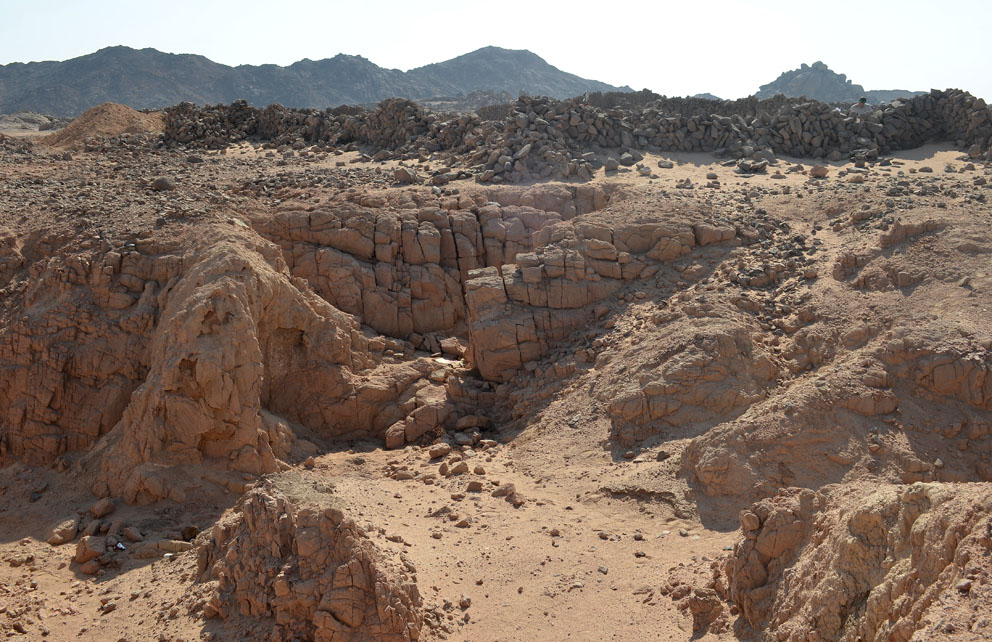 Part of the granite bedrock of the amethyst mine at site 9 in Wadi el-Hudi. The granite has been subject to deep weathering over millions of years. In the background the fortified settlement that was partially built with weathered rock from the mine. Photo by Per Storemyr