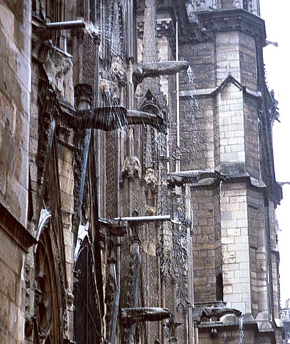 Gargoyles getting rid of water during a heavy downpour at Nrtre Dame in Paris