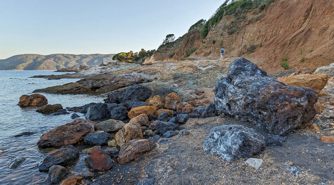 Spiaggia di Terranera: Fe mineralised breccia in the foreground, low-lying Cretaceous schist in the background. Photo by Per Storemyr