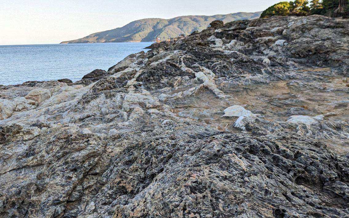 Spiaggia di Terranera: Carboniferous schist intersected by Miocene aplitic dykes, small-scale tafoni in the foreground. Photo by Per Storemyr