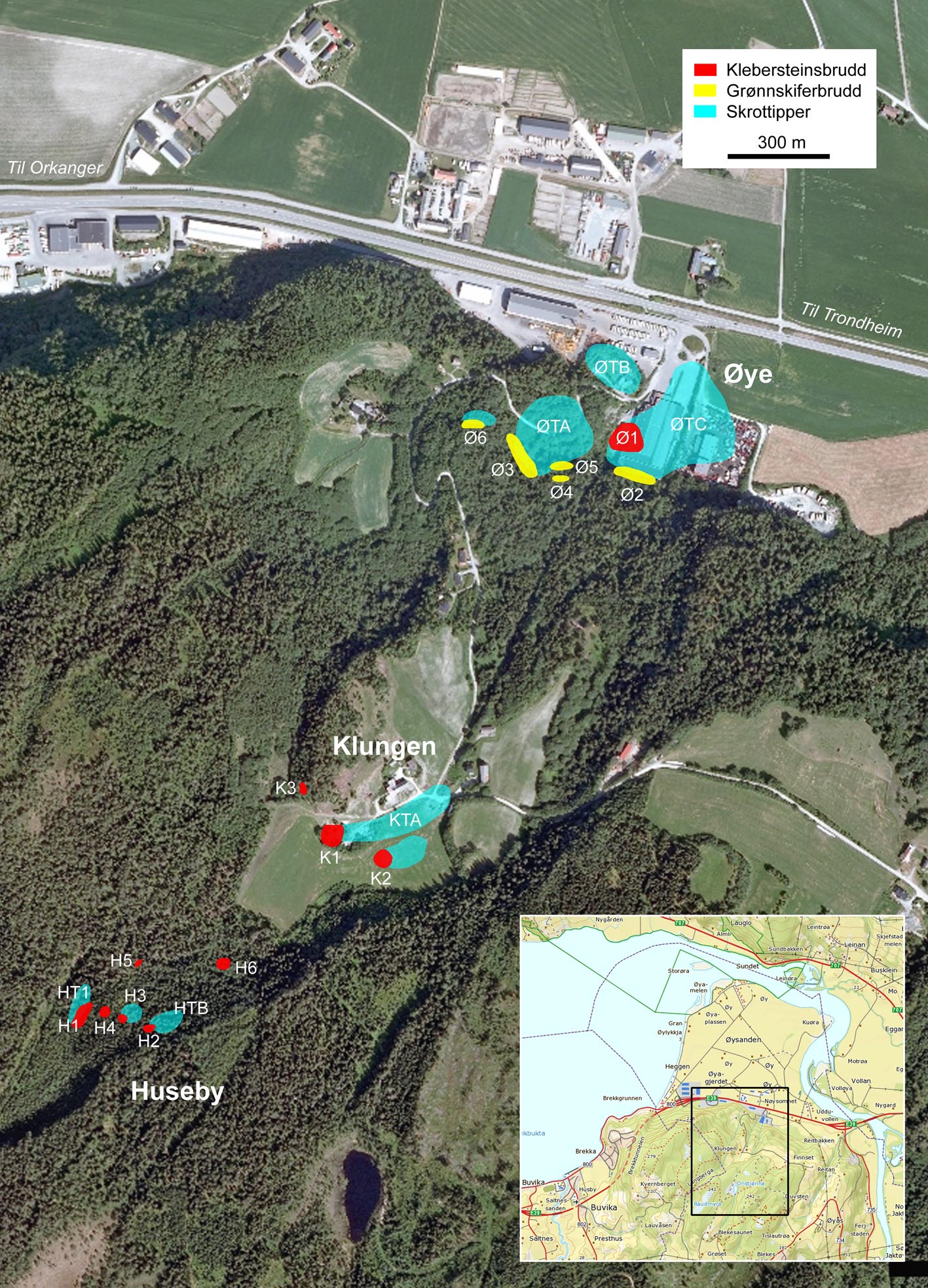 Heldal, T. & Storemyr, P. (1997): Geologisk undersøkelse og arkeologisk registrering av de middelalderske bruddene ved Øye, Klungen og Huseby i Sør-Trøndelag. The Geological Survey of Norway, report, no. 97.149, 55 p. [Geological and archaeological survey of the medieval quarries at Øye, Klungen and Huseby near Trondheim]