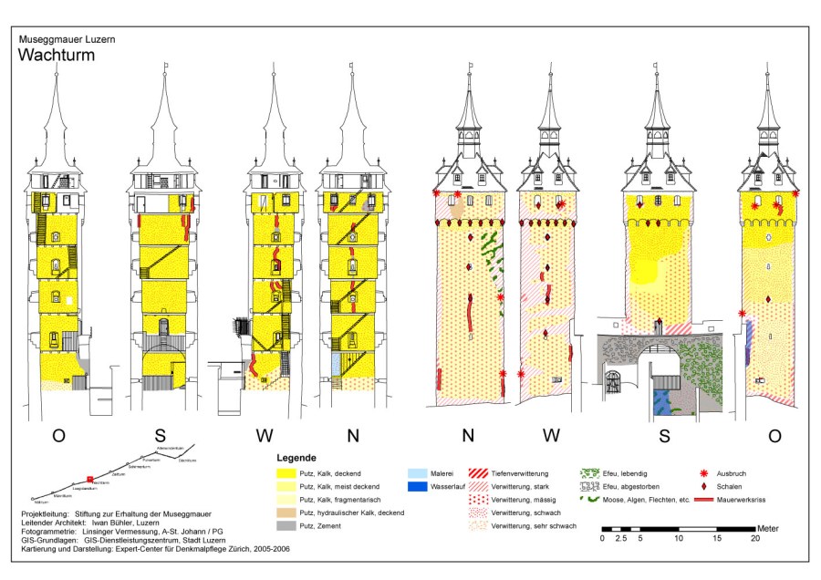 Storemyr, P., Wolf, S. & Küng, A. (2006): Schäden und Gefährdung der Museggmauer in Luzern. Band 1 und Band 2: Karten. Report no. 2006.022, Expert-Center for Conservation of Monuments and Sites, Zürich. Vol. 1: 80 p., vol. 2: GIS-based maps [Damages and risk assessment at the Lucerne City Wall (Museggmauer)]. Download vol. 1 as PDF (14,2 MB). Vol. 1 alternative download. Download vol. 2 as PDF (6,2 MB). View online GIS developed in the project