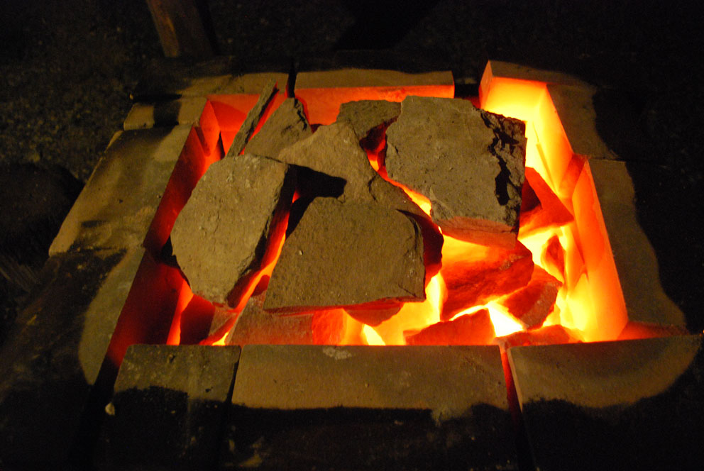 Når gløden i marmoren er endret fra rødoransje til gul, er brenningen ferdig. Ofte vil en også se blålige flammer. En ser at steinplatene på toppen har mye lavere temperatur enn rett under